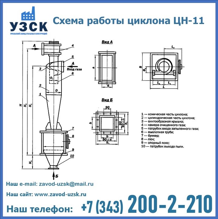 При этом ощутимой разницы в цене между универсальным и узконаправленным, подобранным в соответствии с конкретными техническими требованиями циклоном, нет. Стоимость воздухоочистительного оборудования типа циклон обусловлена маркой и толщиной стали, из которого он изготовлен, сложностью и специфичностью конструкции, наличием дополнительного оснащения (бункер, улитка и другие). При необходимости, на заводе УЗСК в Таразе будет изготовлен циклон по индивидуальным техническим чертежам заказчика.