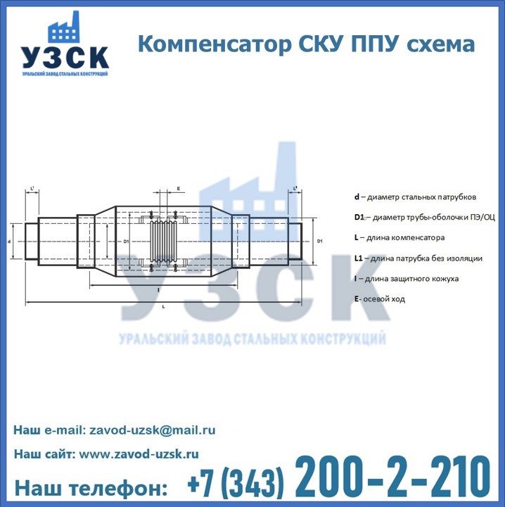 Уральский Завод Стальных Конструкций в Таразе предлагает готовые изделия, а также вы можете приобрести компенсатор СКУ ППУ под заказ. Наш завод располагает всем необходимым оборудованием для производства нестандартных позиций компенсатора СКУ в ППУ изоляции. Завод «УЗСК» предлагает большой выбор качественных и надежных компенсаторов СКУ ППУ, полностью укомплектованных и готовых к эксплуатации. Мы гарантируем соответствие нашей продукции всем требованиям ГОСТ и ТУ, износостойкость и высокую производительность. Наше предприятие поставляет и производит оборудование, имеющее длительную гарантию и большой эксплуатационный ресурс. Если вы хотите заказать сильфонные компенсационные устройства СКУ ППУ или другое оборудование с доставкой, наши специалисты помогут рассчитать стоимость транспортных расходов и организуют доставку товара. Вы можете оформить заказ на продукцию на нашем сайте, для этого достаточно заполнить форму обратной связи.